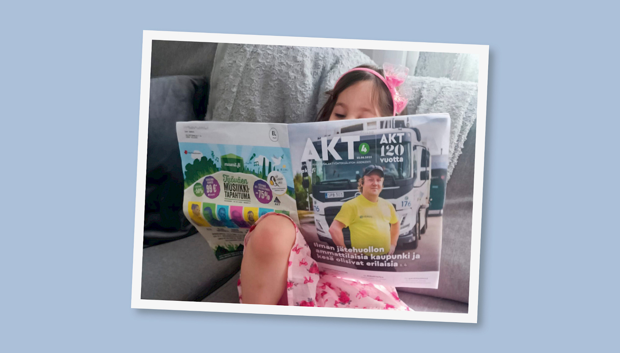 Liisa Suomi nappasi sattumalta Pohjola Liikenteen työsuojeluvaltuutettu Dany Barkhon tyttärestä kuvan, kun tämä oli lukemassa ”isän lehteä” kotisohvalla.