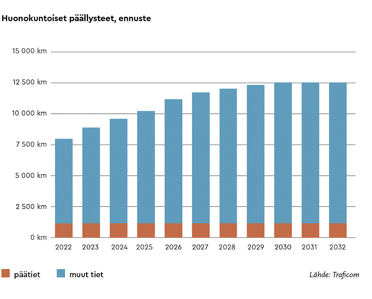 Traficomin viime vuoden lopulla päivitetty ennuste ei lupaa ruusuista tulevaisuutta. Jos mullistavia yllätyksiä perusväylänpidon rahoitukseen ei tule, vuonna 2032 huonokuntoisia päällysteitä on jo 12600 kilometrin verran.