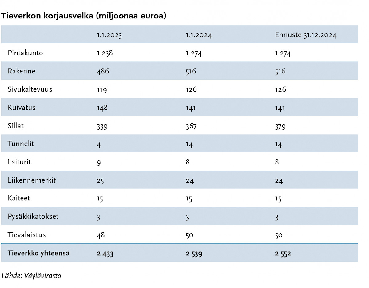 Vuoden 2024 alussa väyläomaisuuden korjausvelka oli noin 4 168 miljoonaa euroa. Siitä maanteille kohdistui 2 539 miljoonaa, rautateille 1 599 miljoonaa ja vesiväyliin 29 miljoonaa.