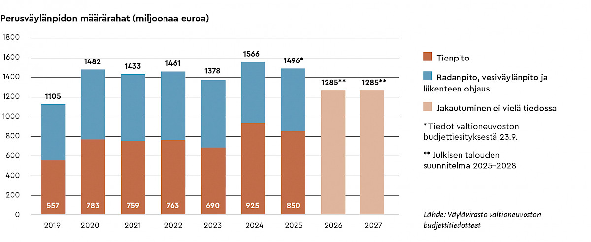 Hallituksen tekemän julkisen talouden suunnitelman eli niin sanotun kehyspäätöksen mukaan perusväylänpidon määräraha on kaudella 2025–2028 vuosittain 1285 miljoonaa euroa. Vaatimatonta perustasoa paikkaamaan hallitus on päättänyt 520 miljoonan euron rahoituksesta korjausvelan kasvun hillitsemiseen.