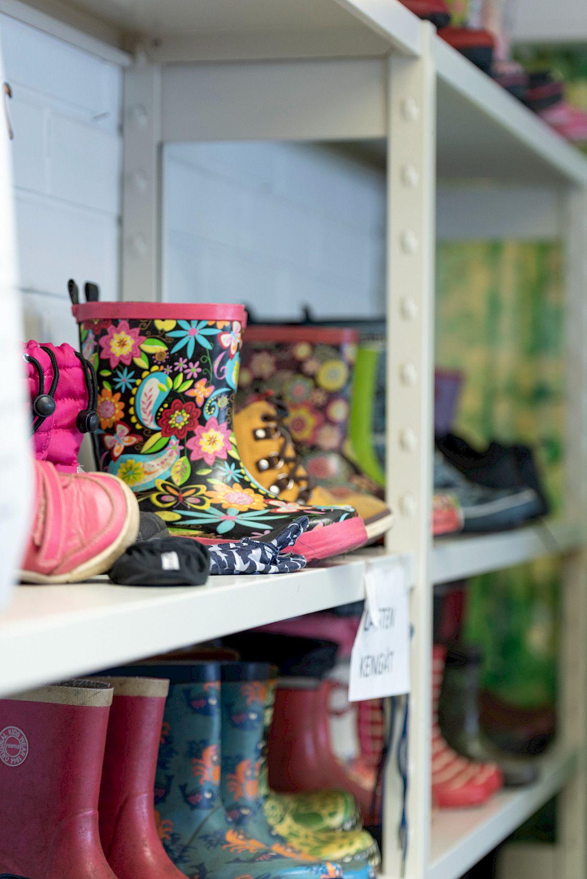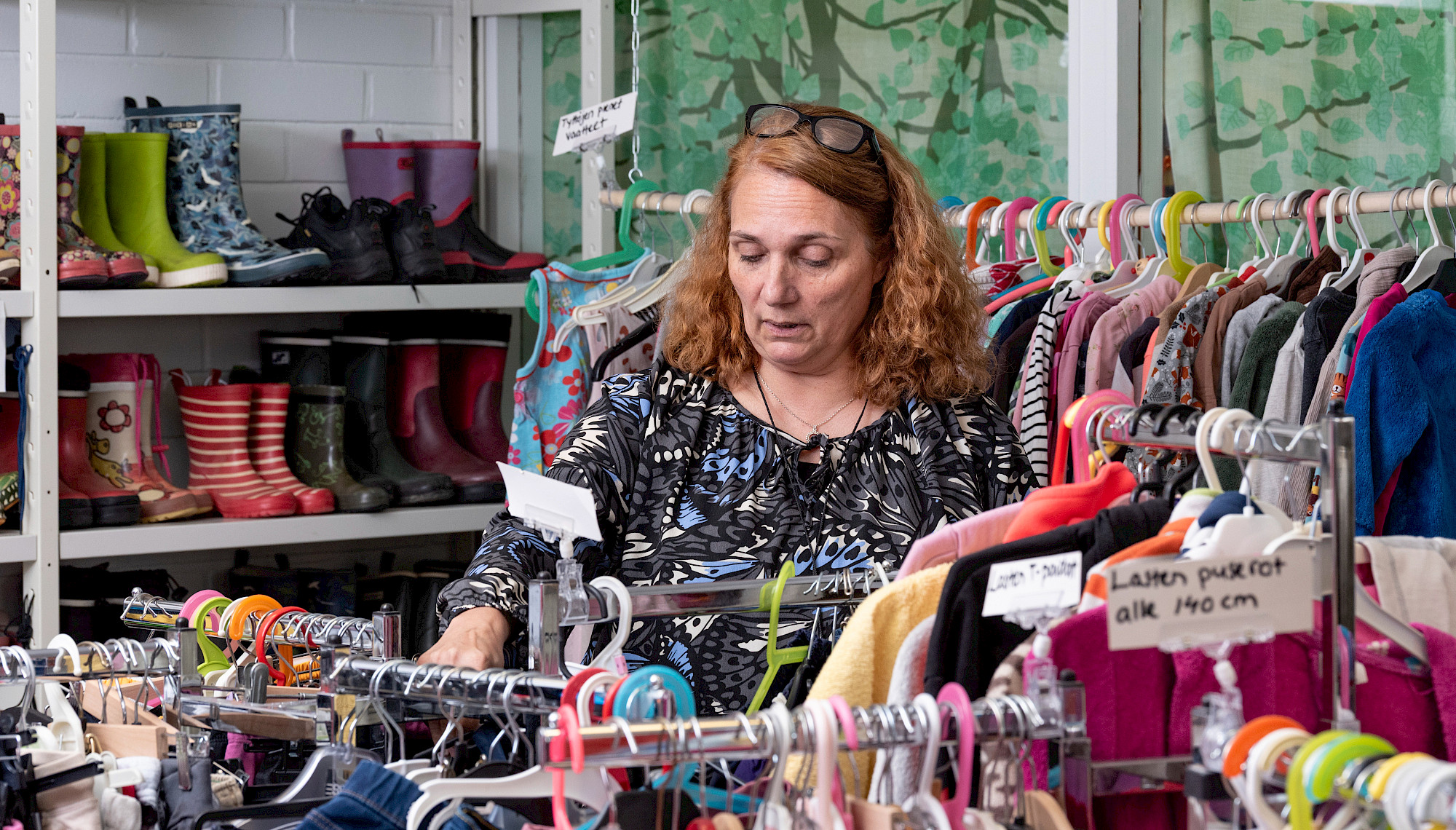 Lastenvaatteet kiertävät hyvin. Päivi Pirtilä kertoo, että ihmiset tuovat pieneksi jääneitä lastenvaatteita ja hakevat sopivampaa kokoa. Teinien ja miesten vaatteista on jatkuva pula.