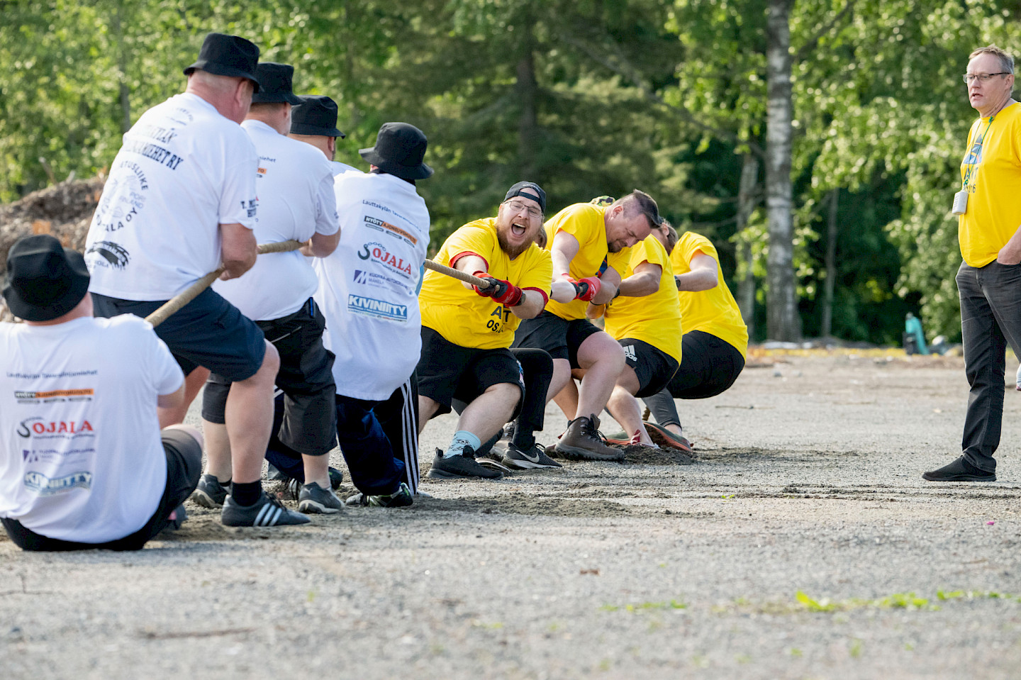 Köydenvedossa oli iloinen tunnelma, kun kolme joukkuetta otti toisistaan mittaa heti kisojen alussa.