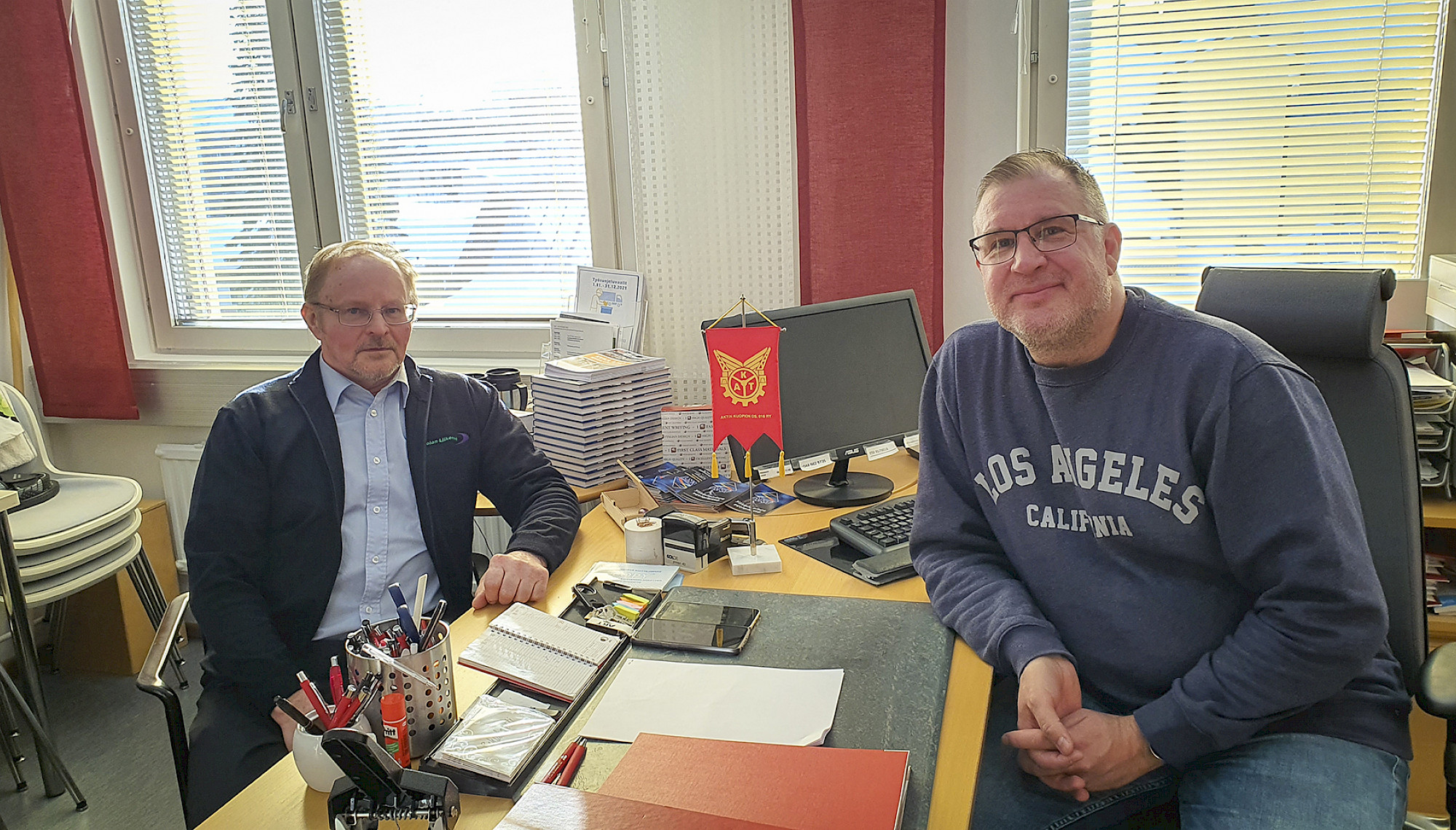 AKT:n Kuopion osaston tuore puheenjohtaja Hannu Turunen (oikealla) ja osastoa kaksi vuosikymmentä johtanut Kauko Lipponen vakuuttavat osaston ovien olevan avoinna uusille ajatuksille ja jäsenille.