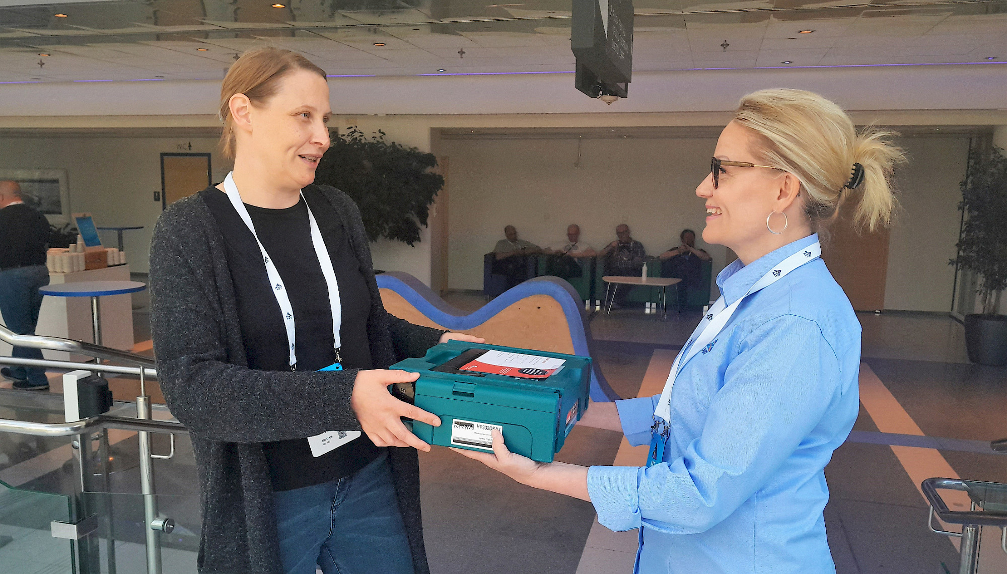 Infopisteellä on iloisesti yllättynyt rovaniemeläinen kuorma-autonkuljettaja, Paula Mansikkasalo (vasemmalla). Hän on juuri saanut tietää voittaneensa vakuutusyhtiö Turvan arvonnassa porakoneen. Palkinnon luovuttaa AKT:n aluetoimistotyöntekijä Maarit Norhio.