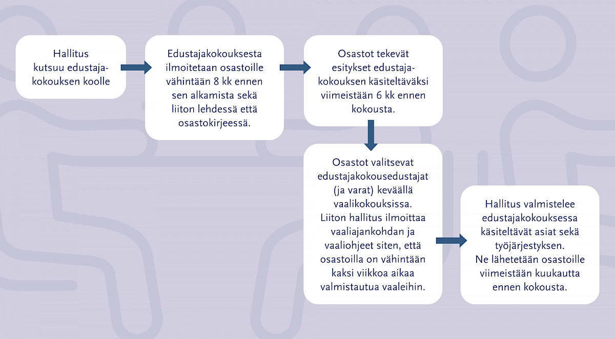 Osastot valitsevat edustajat kokoukseen. Jokaista alkavaa 150 jäsentä kohden osasto saa yhden edustajan sekä hänelle varaedustajan. Osastojen valintakokoukset pidetään keväällä 2026. Valitut edustajat saavat tarkemman perehdytyksen kokouksessa päätettäviin asioihin.
