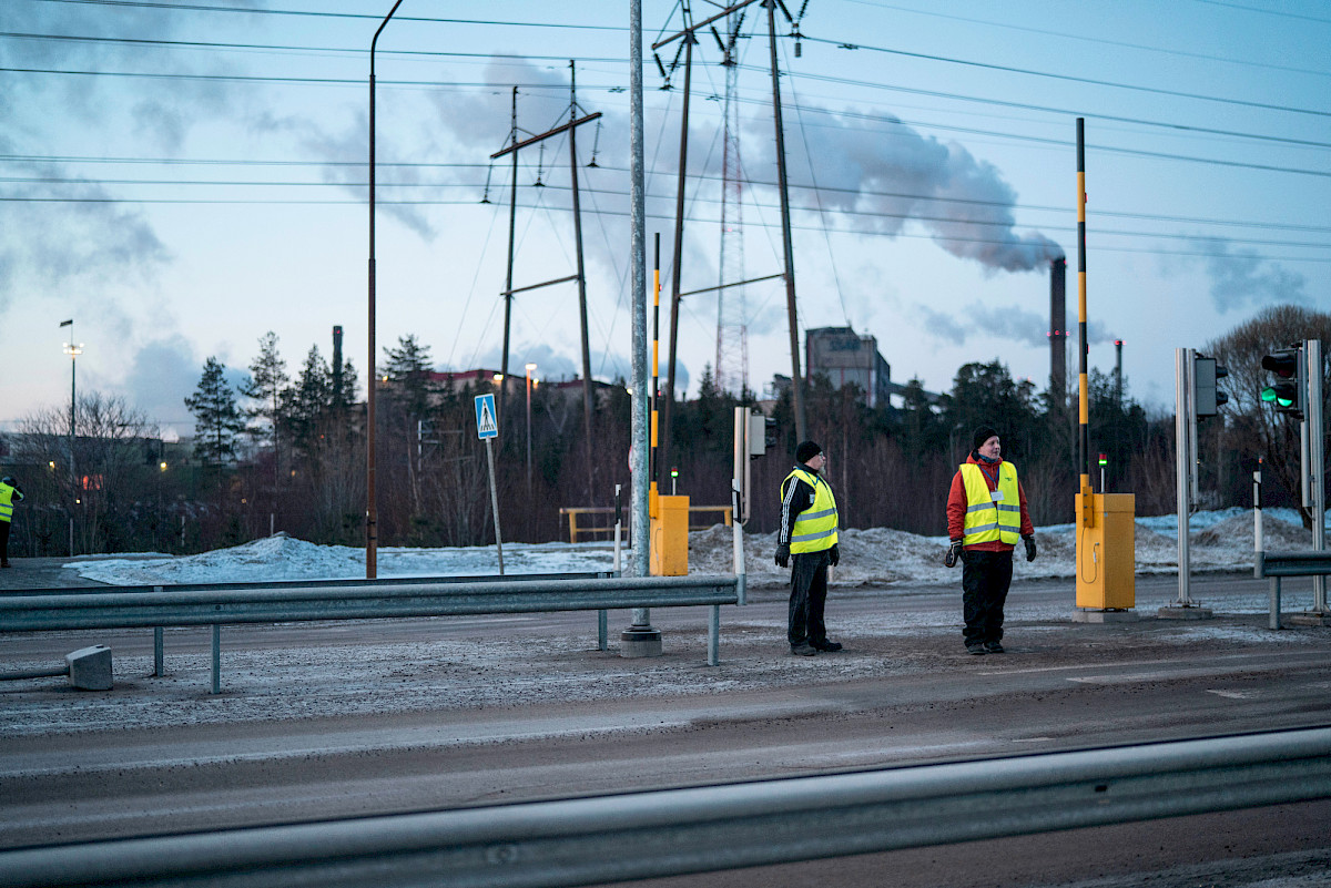 Kylmä viima puhaltaa mereltä Raahessa, mutta se ei työntekijöitä haittaa. Terästehdas SSAB Europen pääportilla autoja ajaa tehtaan porteista sisään. Keltaliiviset teollisuusliittolaiset lakkovahdit kyselevät menijöiltä ajojen tarkoitusta. AKT:n lakkovahdit ovat sataman portilla.