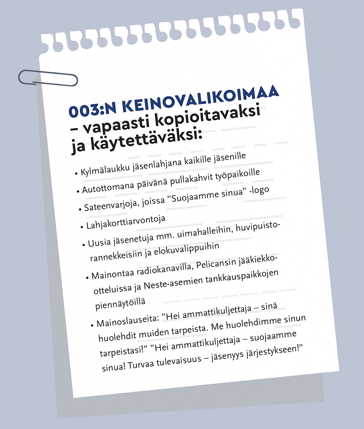 Kunnon kampanjaan pitää tietysti kuulua myös ämpäreitä. Niitä jaettiin ammattiautoilijoille suunnatun radiokilpailun palkintoina, jokaiselle uudelle jäsenelle sekä uuden jäsenen hankkijalle.