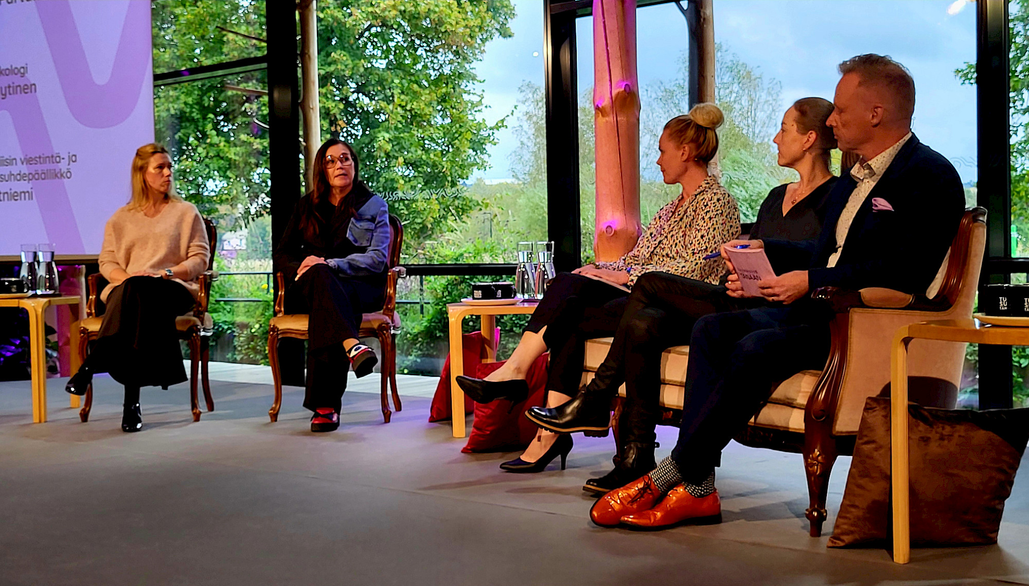 Supon viestintä- ja yhteiskuntasuhdejohtaja Milla Meretniemi, työpsykologi Niina Lyytinen ja sohvalla Maria Markuksen ja Sami Turusen välissä Uusi juttu -median toimittaja Anu Partanen.