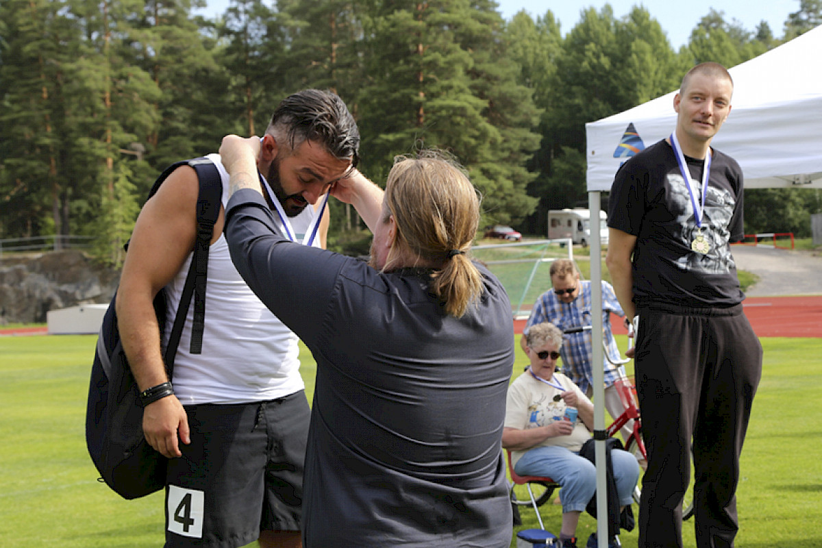 Vakavaa tai ei, palkintojenjakopaikalla kaikki sijoittuneet saavat kaulaansa mitalit juhlallisin menoin. Miesten pituushypyn yleisen sarjan hopea- ja pronssimitalistit, espoolainen Faruk Ferati ja helsinkiläinen Mikko Martinpelto tiivistävät päivän tunnelman:
