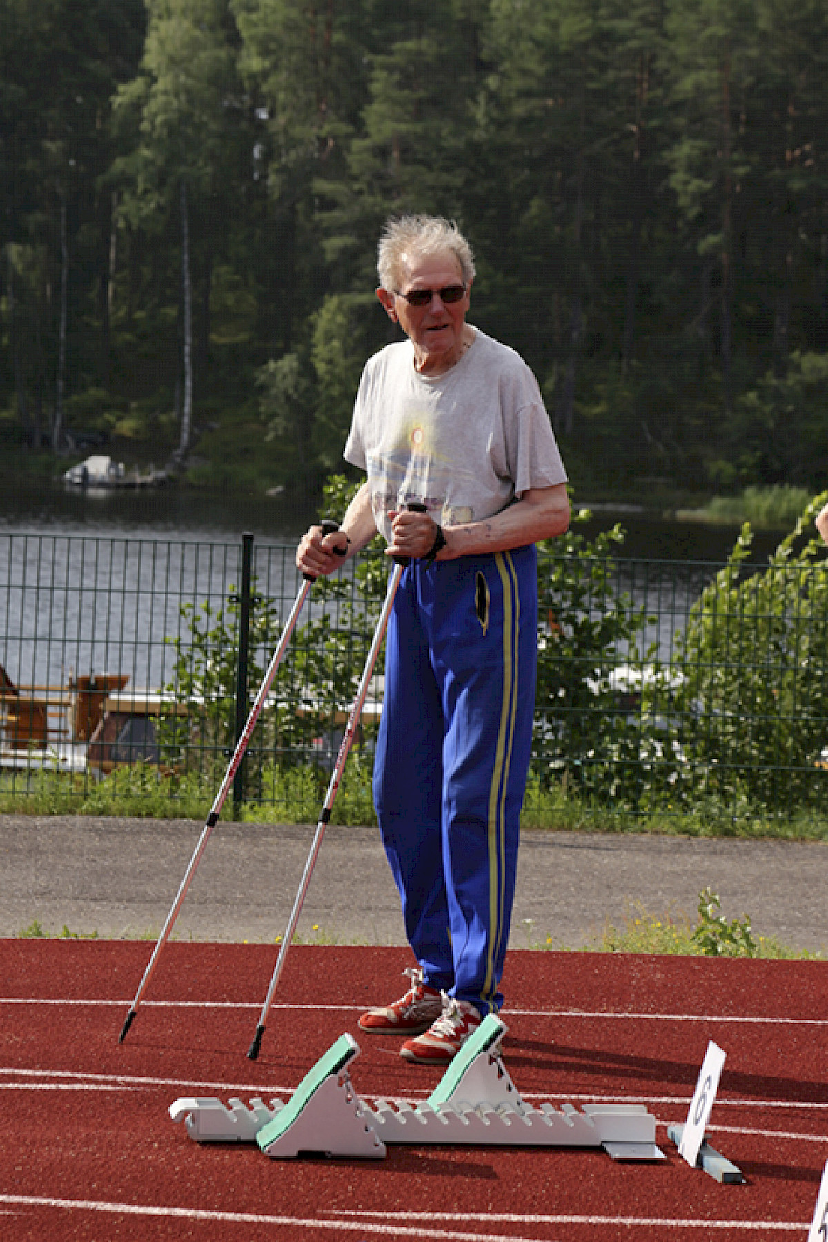 Sadan metrin juoksun lämmittelyalueelta löytyy kisan kenties vanhin osallistuja, oman arvionsa mukaan ainakin. 88-vuotias Veikko Kälviäinen aikoo lähteä radalle kävelysauvat apunaan.