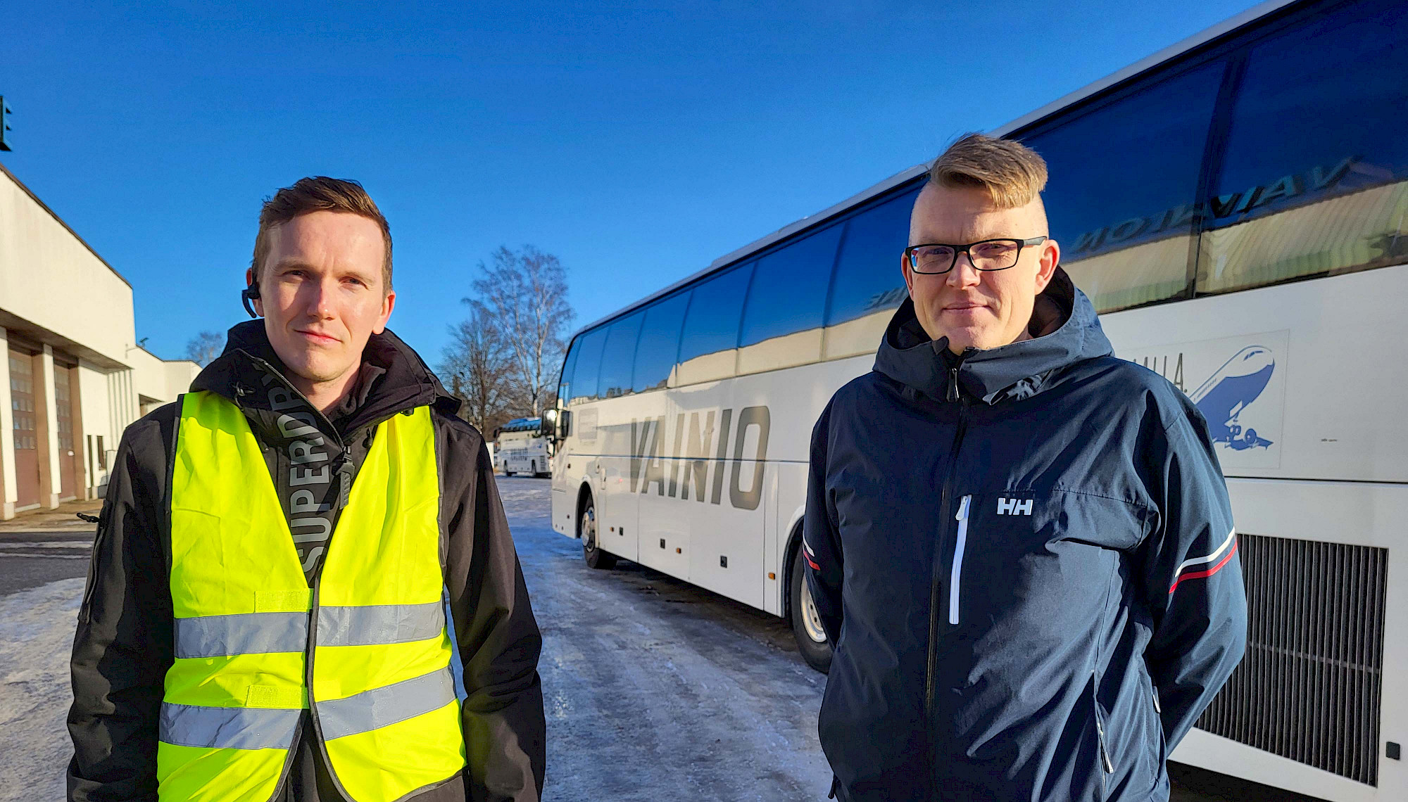 Lakkopäivän auringossa pääluottamusmies Antti Pesu ja varapääluottamusmies Lars-Göran Lassander J. Vainion Liikenne Oy:n Salon varikolla.