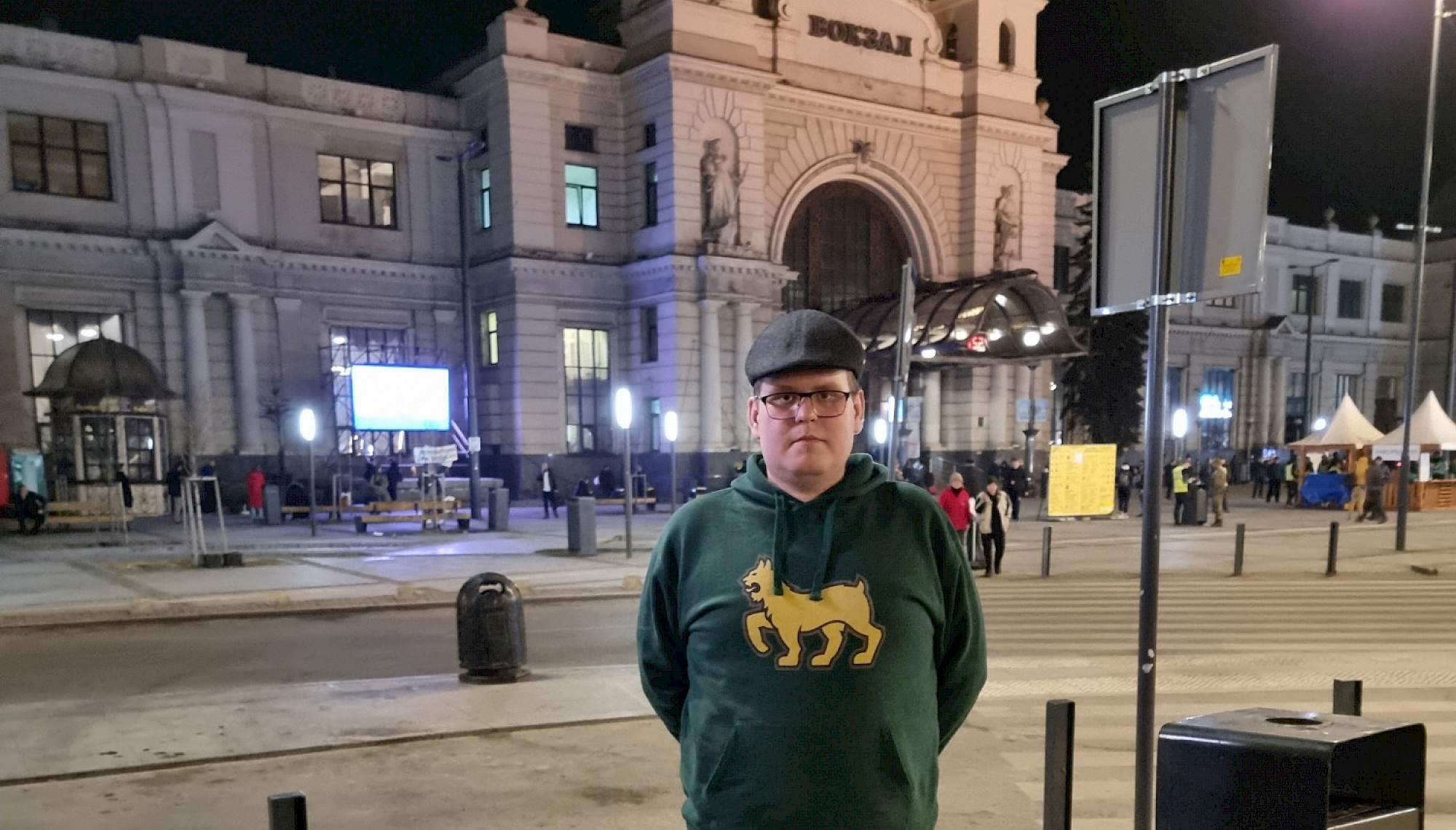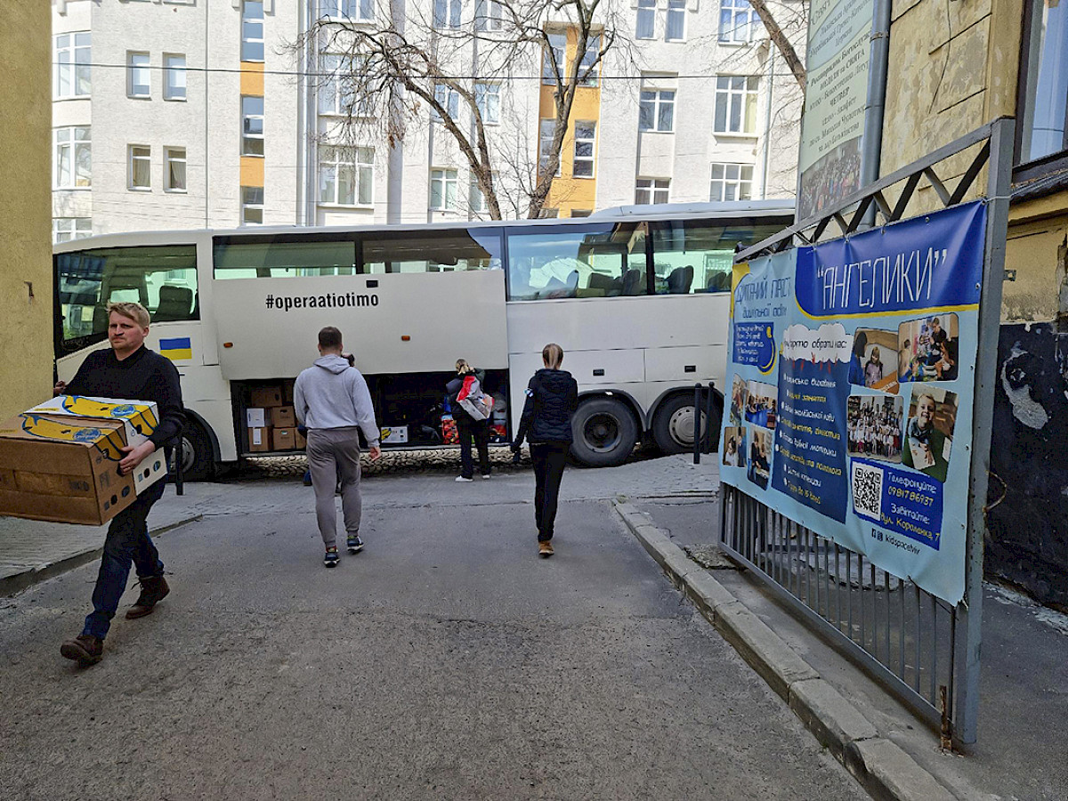Operaatio Timon mukana linja-autonkuljettaja Janne Tammisalo on ollut mukana auttamassa pakolaisia turvaan Ukrainasta. Edestakainen matka on noin 3000 kilometriä ja turvallisuussyistä autossa on aina useampi kuljettaja. Kuva Lvivin rautatieaseman edustalta.