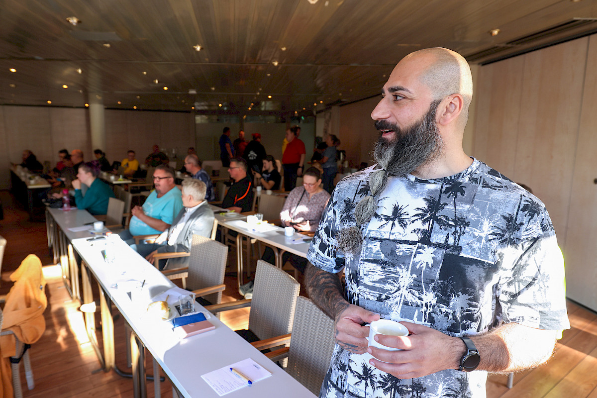 Pohjola-Liikenteen työsuojeluvaltuutettu Danny Barkho Finnoon varikolta oli linja-autopäivillä ensimmäistä kertaa ja piti asiasisältöä kiinnostavana. Samalla se oli kertausta tuoreelta luottamushenkilökurssilta. Hänen työpaikallaan aiotaan ottaa puheeksi syksyn iso aihe, kansalaisaloite palkkavarkauden kriminalisoinnista.