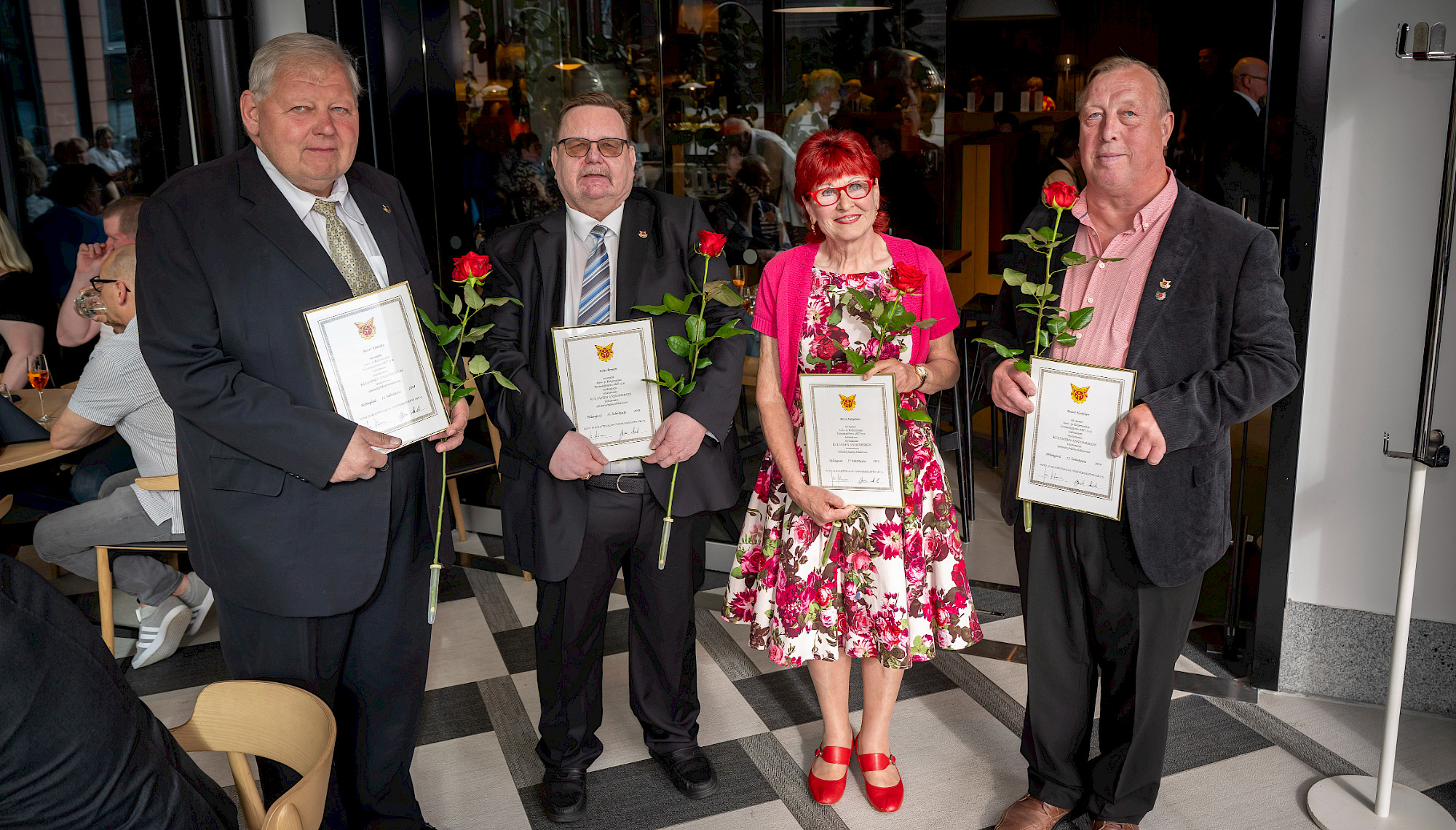 Kultaisen ansiomerkinsaajat (vasemmalta) Rauno Kuusisto, Keijo Reiman, Ritva Hakulinen ja Rauno Keskinen.
