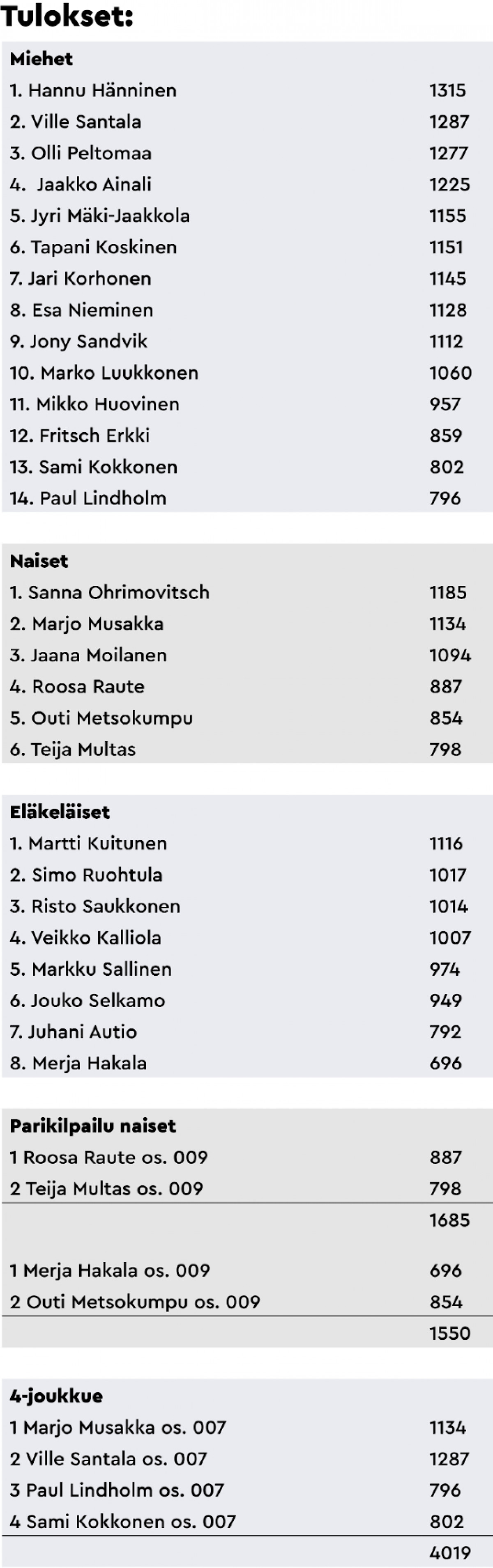 Muut voittajat keilakisassa olivat: miehet Hannu Hänninen (1315), eläkeläiset Martti Kuitunen (1116), naiset pari Roosa Raute ja Teija Multas (yhteensä 1685), miehet pari Ville Santala ja Marjo Musakka (yhteensä 2421) sekä 4-joukkue Marjo Musakka, Ville Santala, Paul Lindholm ja Sami Kokkonen (yhteensä 4019).