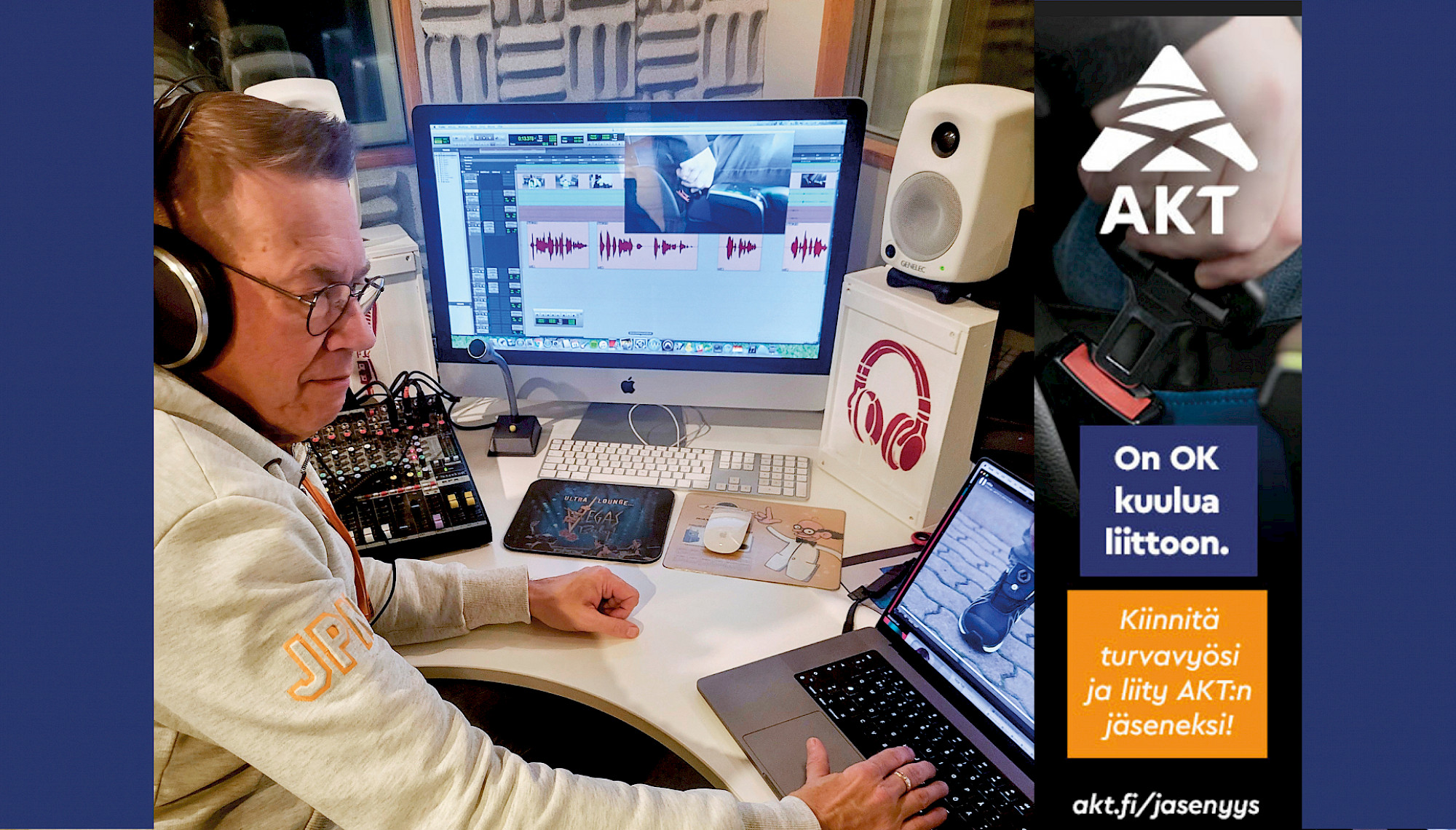 doop, ja siellä yhteistyökumppaneina erityisesti Mikko Samuli, Mikko Kovasiipi ja Kari Toivonen, toteutti myös erilaiset somemateriaalit, värilliset ja mustavalkoiset flyerit sekä eri kokoiset videot eri kanaviin: YouTubeen, Instagramiin ja Facebookiin sekä Spotifyhin. Kuulostaa selkeältä – mutta taustatyö vaatii lukemattomia puheluita, sähköpostiviestejä ja suunnittelua: ovatko äänet ja turvavyön klikkaukset kohdallaan. Tehdäänkö vielä tekstitys? Onko mustavalkoinen flyer parempi tulostaa? Parissa viikossa saatiin kuitenkin valmista. Jälkikäteen seurataan, mikä määrä klikkauksia AKT:n nettisivuille tästä syntyy. Jokainen AKT:n jäsen saa muuten mielellään pistää myös videon jakoon.