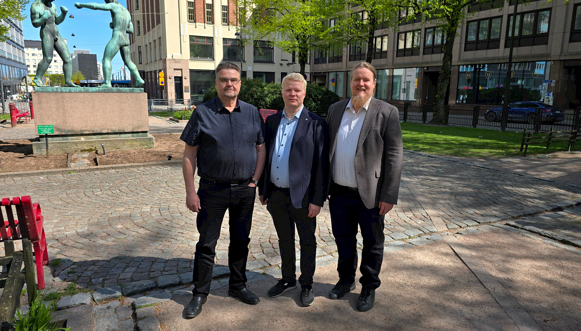 AKT:n valtuuston kokous Paasitornissa 21.5. Kuvassa vasemmalta valtuuston puheenjohtaja Kai Laaksonen, AKT:n 2. varapuheenjohtaja Niko Blom ja puheenjohtaja Ismo Kokko.