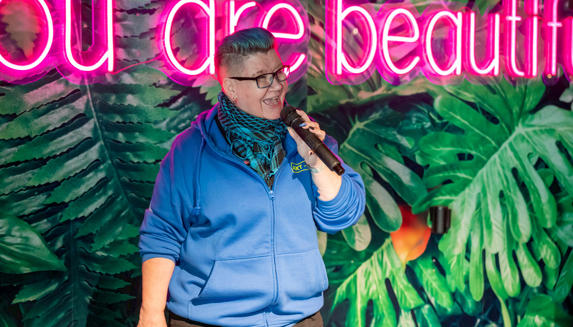 Lähistöllä Vantaalta saapunut osasto 007:n porukka odottaa malttamattomana, että osaston toivo Johanna Salama pääsee laulamaan.