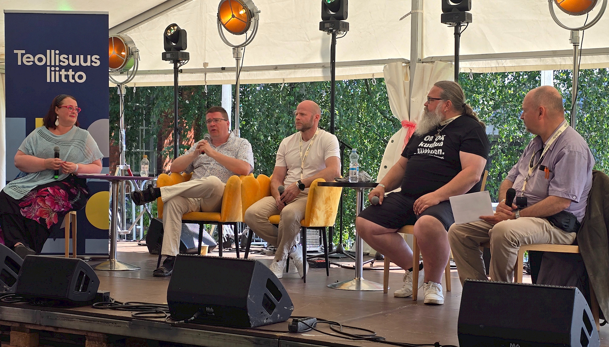 Toimittaja Jari Korkin (kuvassa oikealla) vetämässä keskustelussa, mukana oli pääluottamusmies, ahtaaja ja AKT:n valtuuston varapuheenjohtaja Jape Lovén, kansanedustaja Aleksi Jäntti (kok.), Insinööriliiton puheenjohtaja Samu Salo sekä kansanedustaja Pia Lohikoski (vas.)