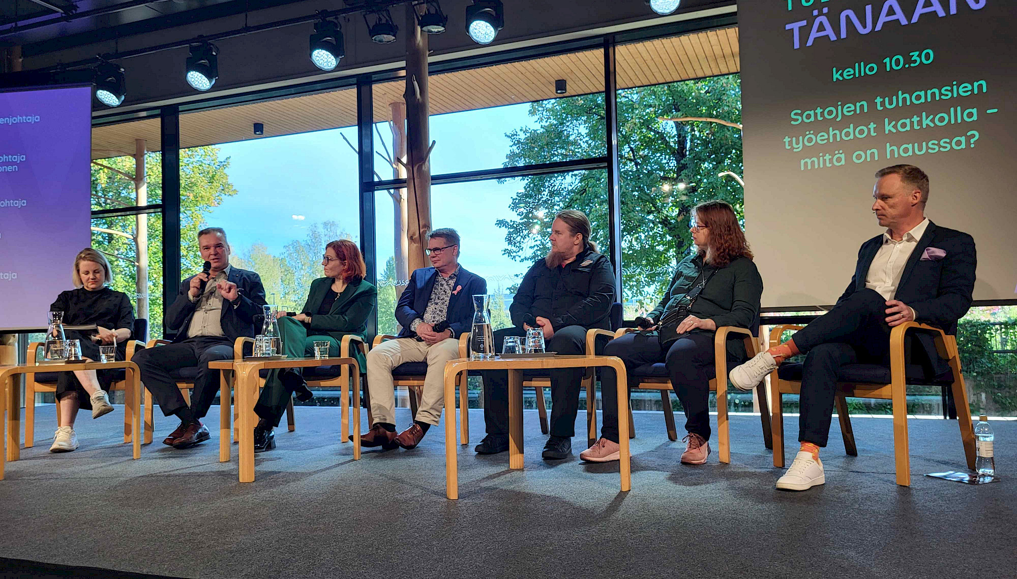 Juontaja Laura Friman (vas.), Sähköliiton puheenjohtaja Sauli Väntti, PAMin puheenjohtaja Annika Rönni-Sällinen, SEL:n puheenjohtaja Veli-Matti Kuntonen. AKT:n puheenjohtaja Ismo Kokko, Teollisuusliiton puutuotesektorin johtaja Katariina Stoor ja juontaja Sami Turunen Tulevaisuus tänään -tapahtumalavalla. SAK:n puheenjohtaja Jarkko Eloranta linjasi avasi SAK:n järjestämän Tulevaisuus tänään -tapahtuman Pikku-Finlandiassa 5.10. Helsingissä.