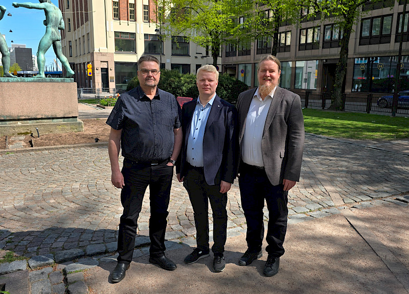 AKT:n puheenjohtaja Ismo Kokko valtuuston syyskokouksessa Helsinki Congress Paasitornissa 20.11. Kuvassa oikealta valtuuston 1. varapuheenjohtaja Jape Lovén, AKT:n 2. varapuheenjohtaja Niko Blom sekä johdon- ja hallinnon assistentti Maarit Norhio.
