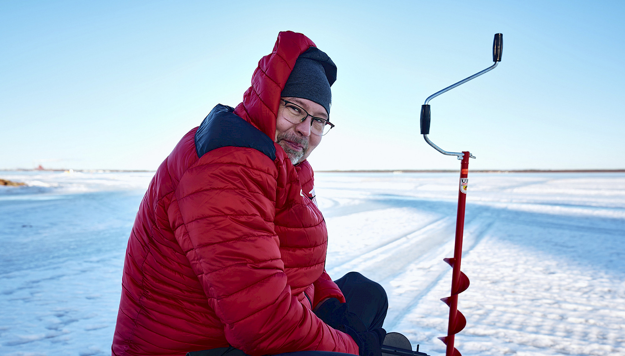 Tuuli meinaa viedä tukankin päästä, joten Tamminen ei tänään jää odottelemaan saalista pilkkiavannosta, vaikka kuva kalasaaliista olisikin leuhkaa laittaa lehteen.
