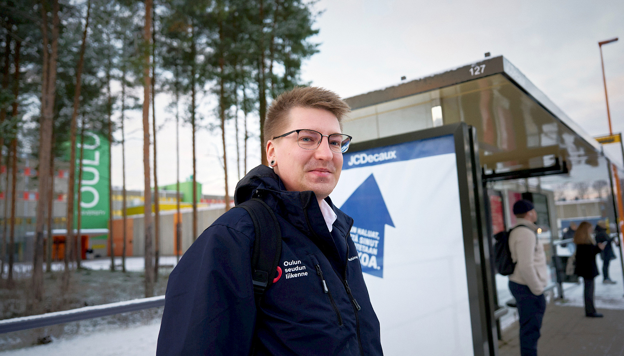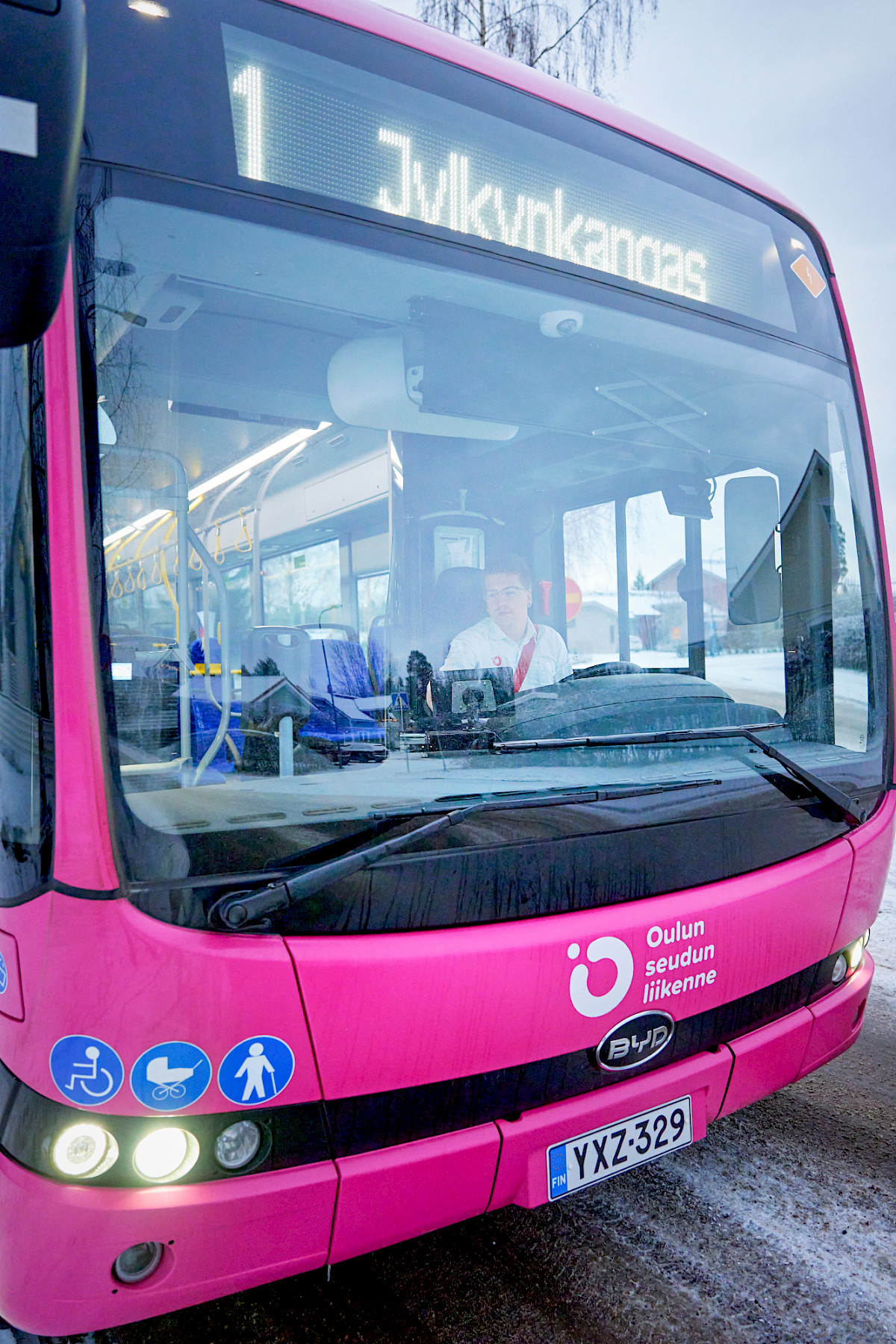 ”Terve! Kiitos! Terve!”, kuljettaja Niko Huovinen moikkaa jokaisen linja-autoon nousevan asiakkaan. Hetkeä aiemmin hän on seurannut Nobinan varikon taukotilassa Oulun Ruskossa näyttötaulun opasteita, jossa työnvuoroaan aloittavien kuljettajien nimet liikkuvat listassa ylöspäin sitä mukaa, kun työvuoron aloitus lähenee. Tänään Huovinen ajoi siirtoautolla Oulun yliopistolle ja hyppäsi linjan numero 1 rattiin.