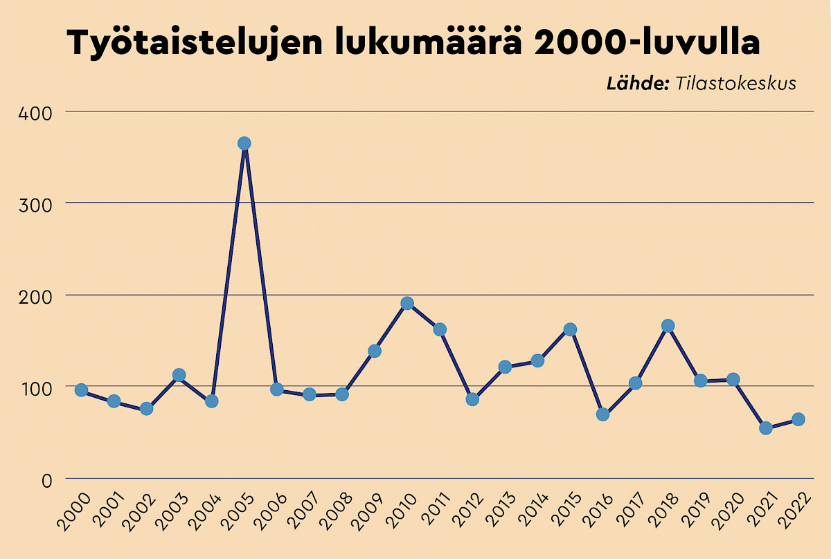 Suomessa Tilastokeskus kerää vuosittain tiedot työtaisteluista. Niiden määrä vaihtelee suuresti. Esimerkiksi viime vuonna työtaisteluissa menetettiin työpäiviä selvästi enemmän kuin aiemmin 2000-luvulla. Vuonna 2021 taas työtaistelujen lukumäärä oli matalin yli 50 vuoteen.
