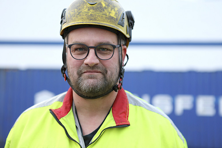 – Jag jobbar allt från kran till fots, men inte lasträkning, det vill säga taljarbete, beskriver Jori Hedback sitt arbete.