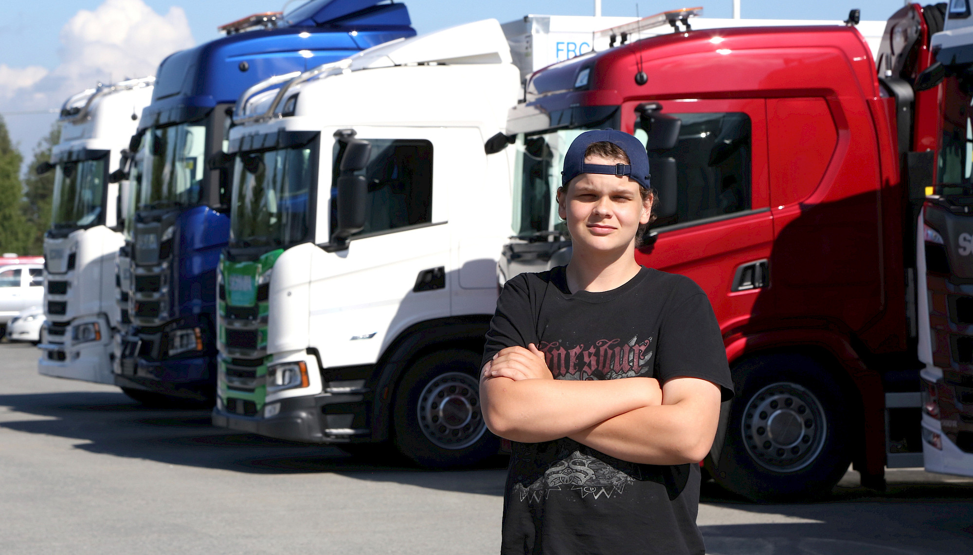 Joonas Karhiaho aikoo ajaa ammatikseen rekkaa. Kesätyö Scanian varustamolla ei ole vielä aivan sitä mutta sinne päin.