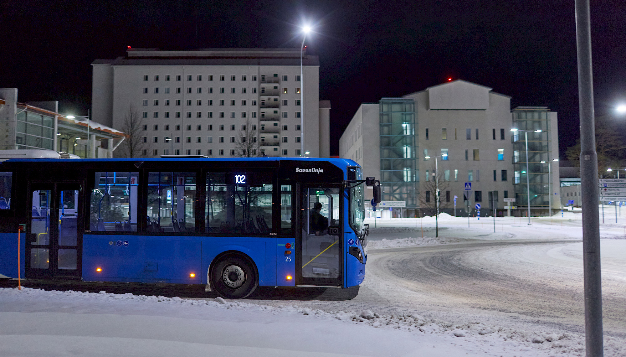 Rollaattorinsa kanssa kaatuneen naisen onneksi linja-autonkuljettaja piti tärkeimpänä asiana hänen auttamistaan. Muut matkustajat saivat odotella, kun kuljettaja riensi naisen avuksi. Pakkaskelissä kaatuminen ei ole leikin asia. Kuva otettu sairaalan tuntumasta myöhempänä ajankohtana, eikä kuvan auto liity tapahtumaan..