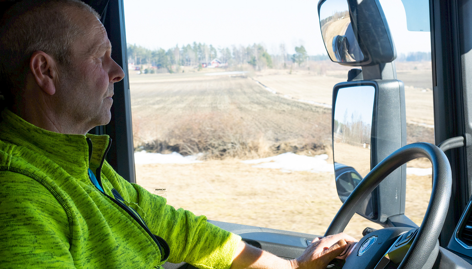Bo Eriksson, 60, har även många andra uppgifter än att bara köra påhängsekipage. Han lastar bland annat 95 kubikmeter trähack 2-3 gånger om dagen med en skoplastare i en lastbil som ägs av Transmar. Han transporterar hacket som går till värmekälla, till hamnen i Långnäs, varifrån släpvagnarna överförs till et fartyg och sedan över havet till Nådendal. Vi slapp med på vägen till Långnäs med Eriksson, som kört lastbil i 41 år.