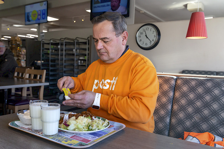 Lounaan aika on klo 11–13, riippuen kyydissä olevan postin määrästä. Öhmanin työnantajalla on useampi sopimusruokapaikka reitin varrella, mutta useimmiten hän syö lounasta Keminmaan Tupasvillalla.