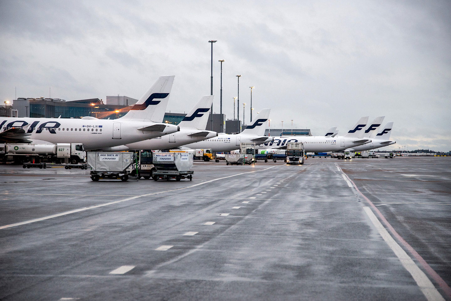 Flygfältsområdet är som sin egen stad – en myrstack, där tiotusen människor jobbar samtidigt som mest. På själva perrongen kör utöver bussarna en mängd varierande utrustning, som transporterar till exempel bränsle, bagage och mat till flygplanen.