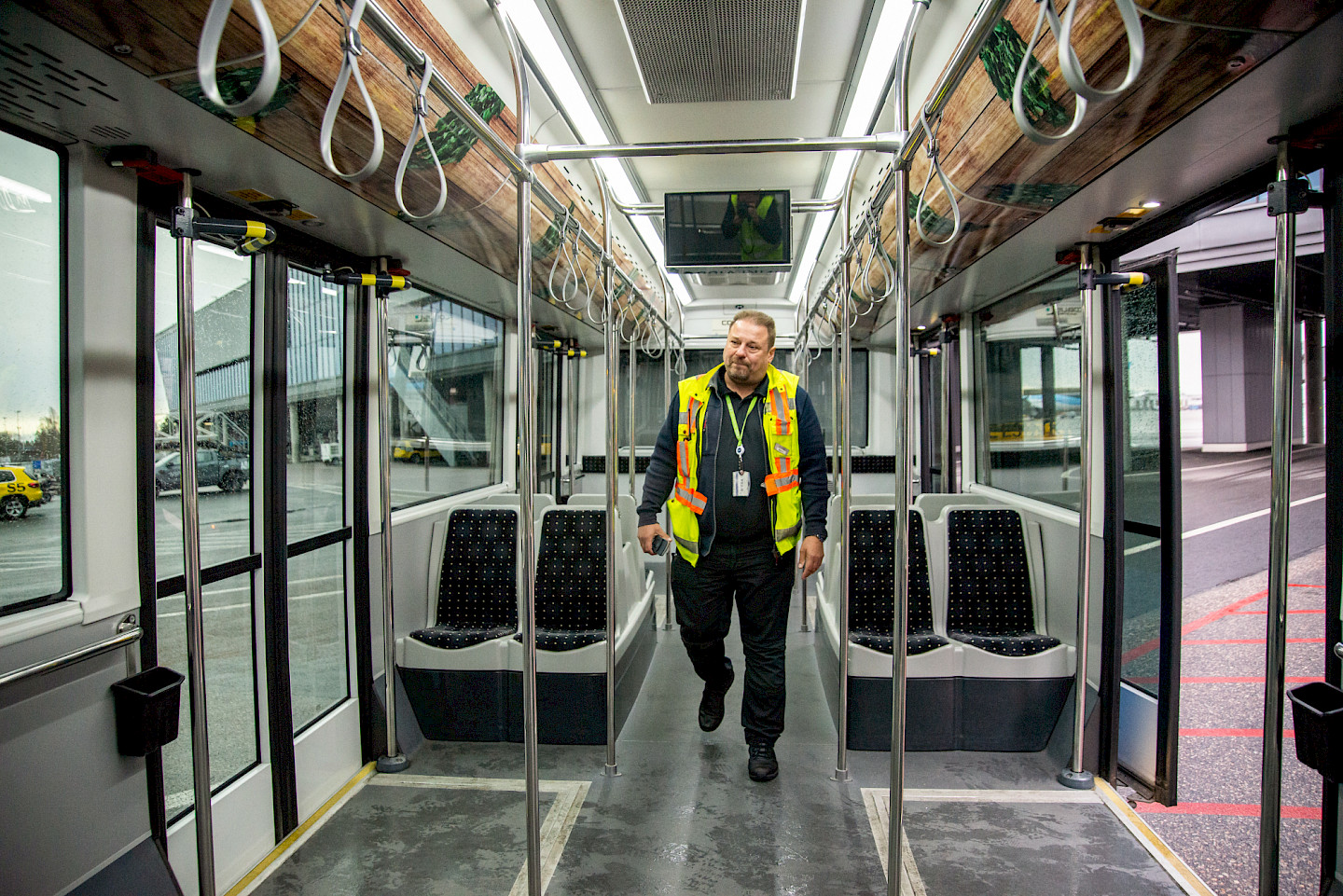 Mika Kulmala jobbar på flygfältet som rampbussförare. Till förarens uppgifter hör också passagerarövervakning.