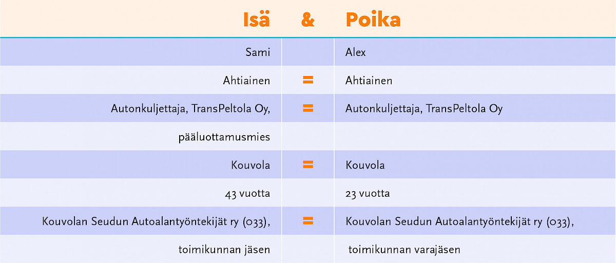 Kouvolalaiset Alex ja Sami Ahtiainen – poika ja isä − työskentelevät kuljettajina TransPeltola Oy:n palveluksessa. Kumpikin on mukana myös Kouvolan Seudun Autoalantyöntekijöiden toiminnassa.