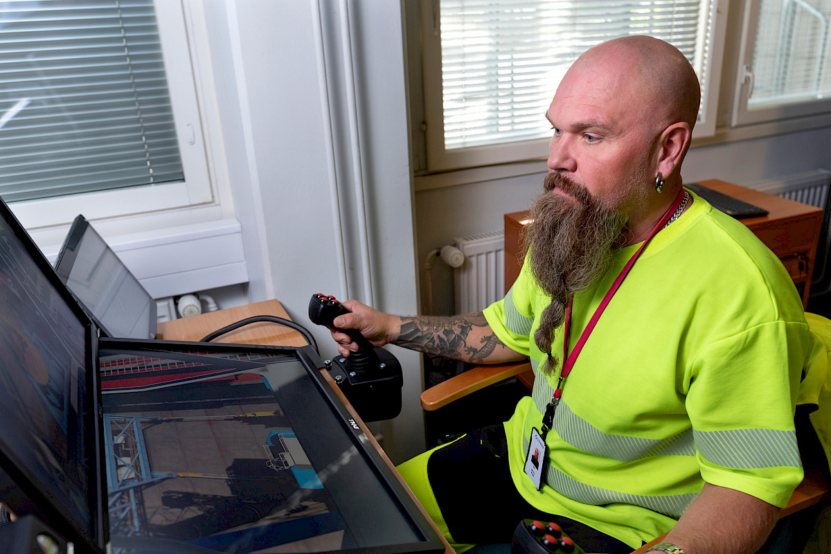 Kotkan ahtaustyöntekijöihin kuuluva Mikko Posti kokeilee simulaattoria, joka tuntuu melko realistiselta – mutta herkemmältä kuin aito nosturi.
