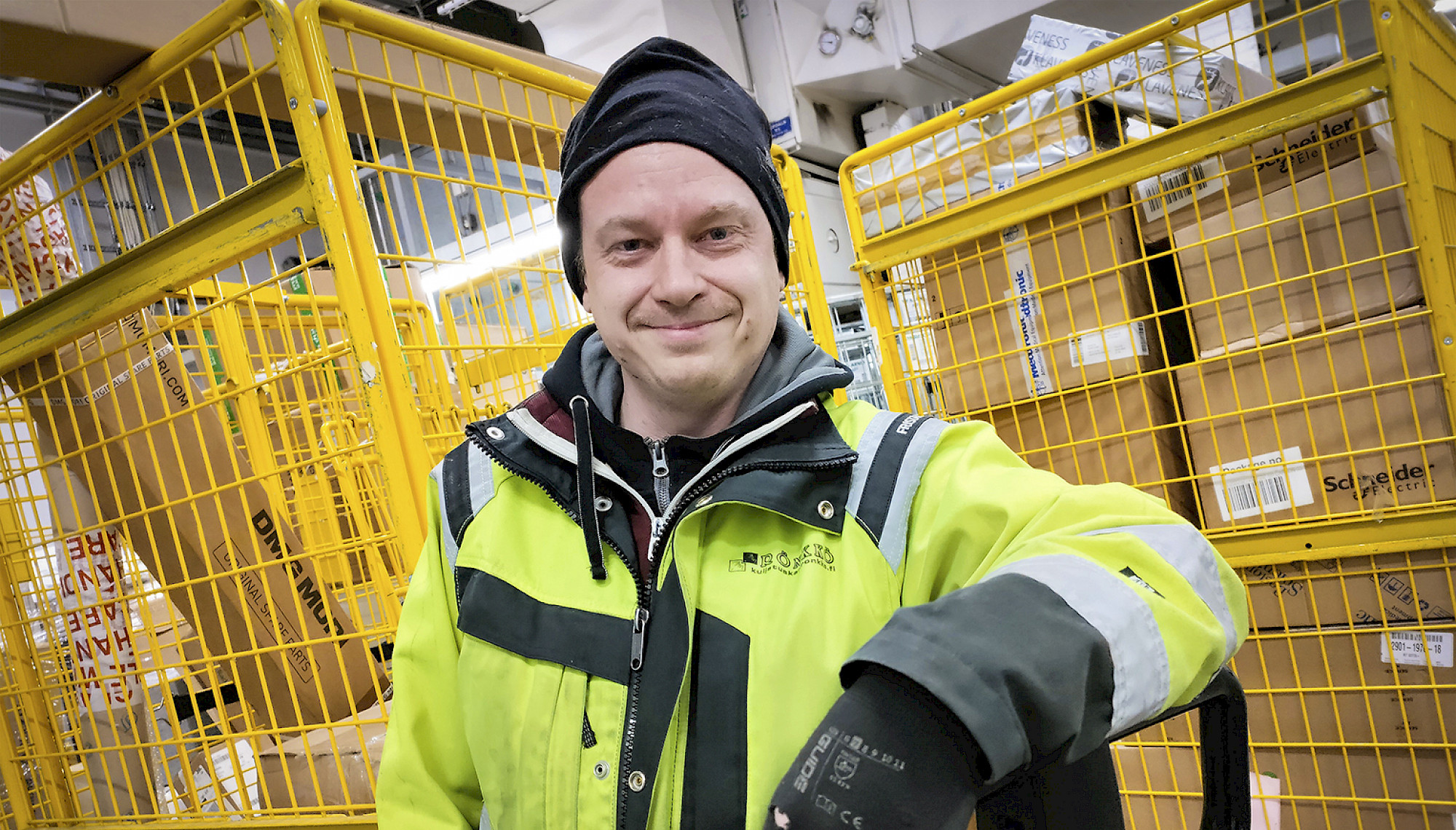 Huli saa kyytiä, kun Kainulainen rullailee tavarat terminaaliin, missä kollega siirtää ne jatkoon. Vartissa kuorma on purettu. Paluulastiksi tulee saman verran eli puoli autollista.